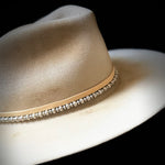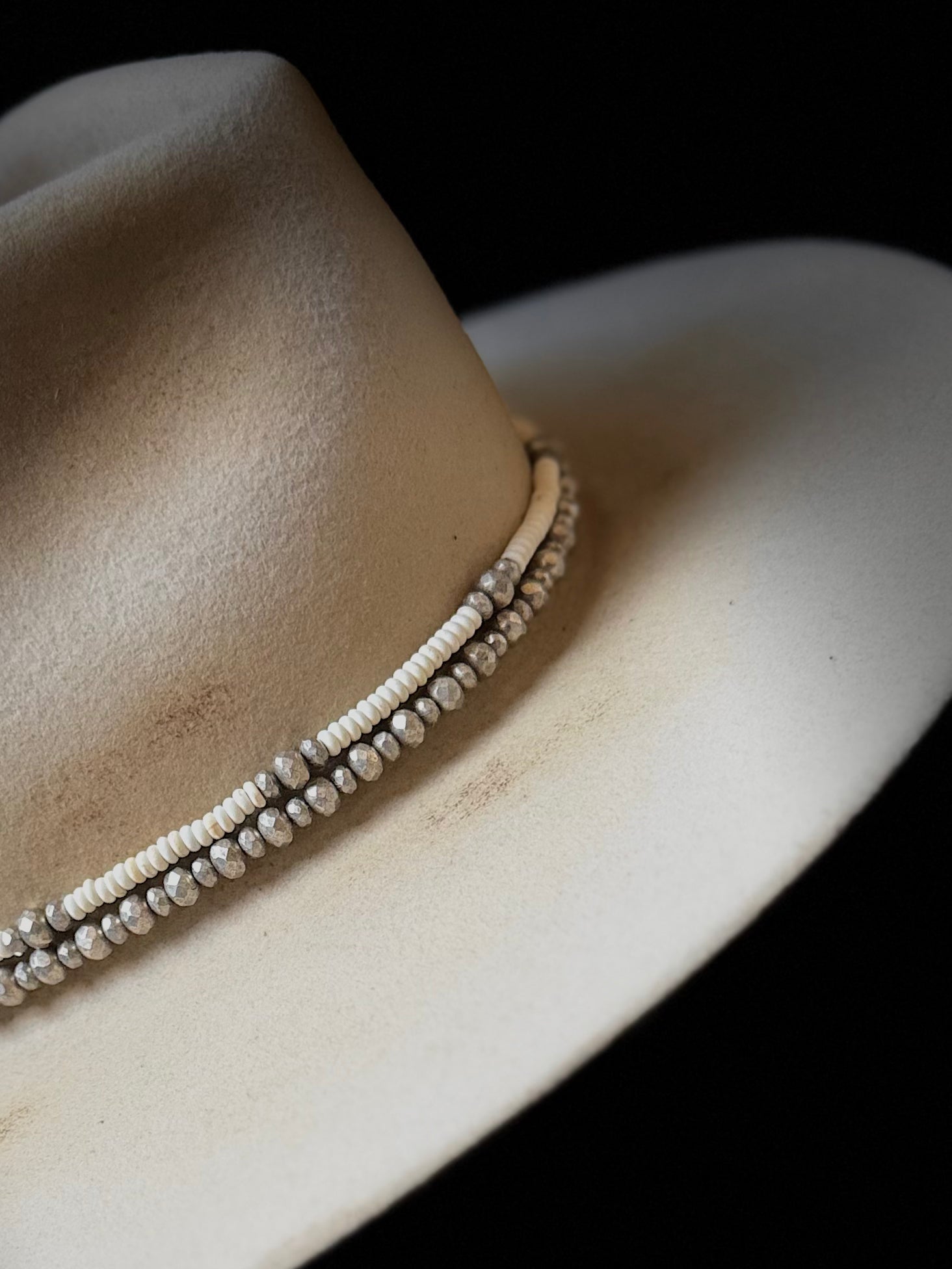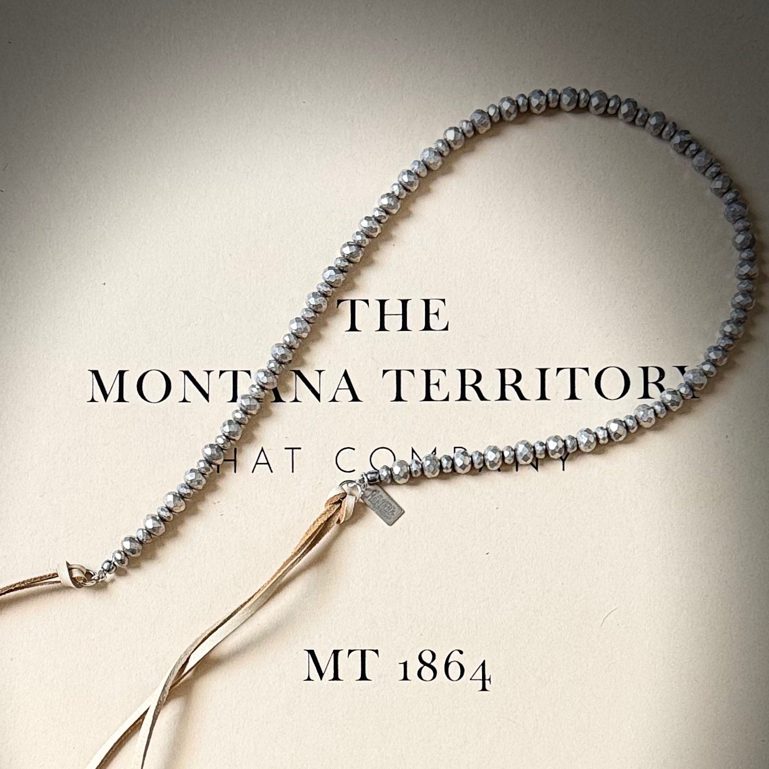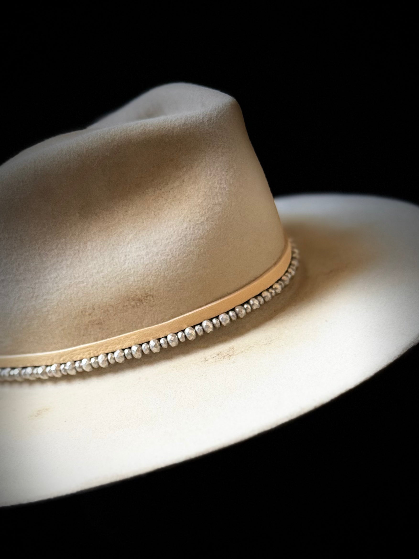 This hat band features antique silver finished faceted beads in alternating sizes. The perfect addition to any hat, this band is adjustable with 1/8" tan deerskin leather lace ties at the center back. You may trim the leather ties to your desired length. We tend to style them hanging off the back of the hat slightly.