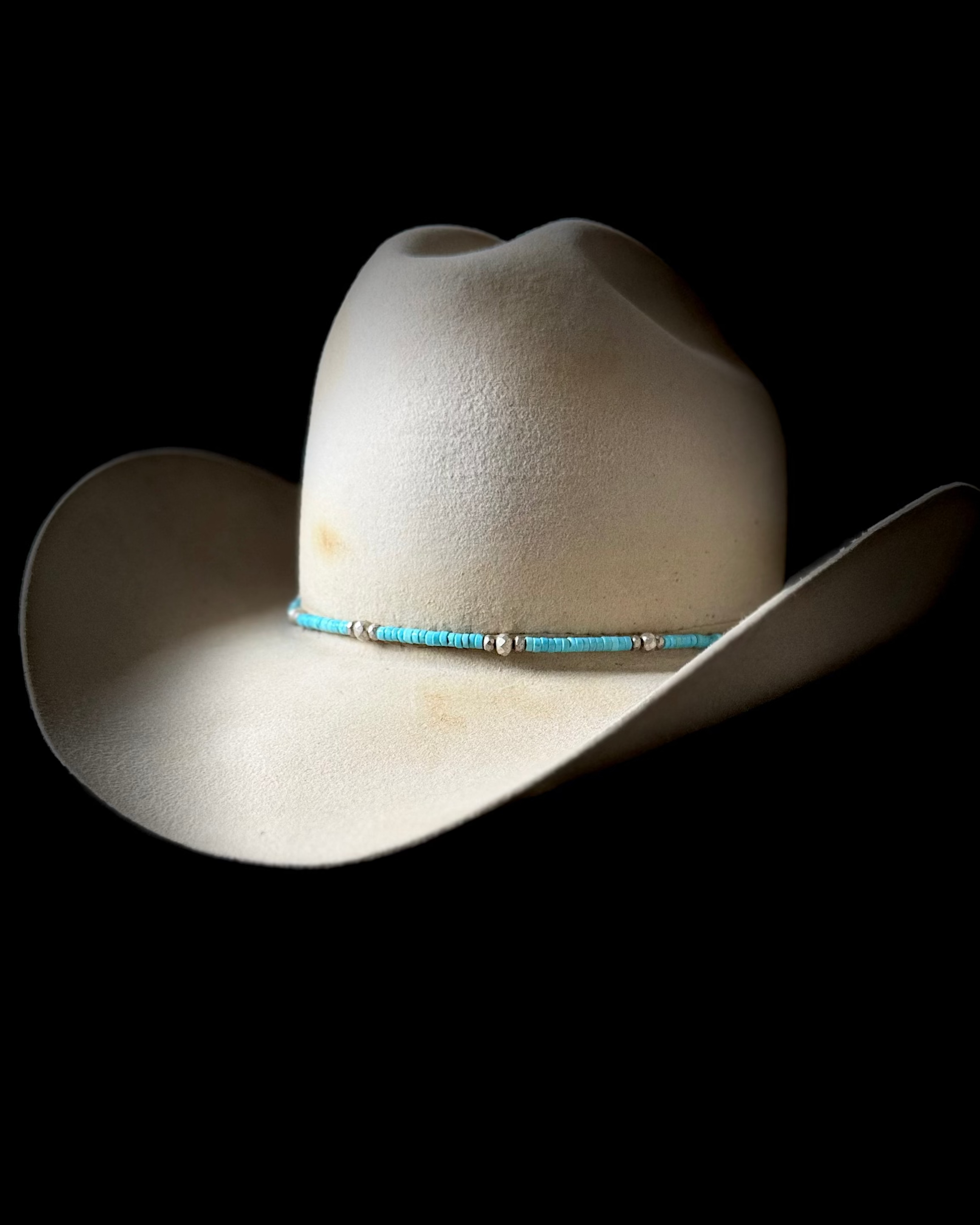Inspired by vintage silver and turquoise, this hat band features a mixture of turquoise heishi beads and antique silver faceted beads. The perfect addition to any hat, this band is adjustable with 1/8" tan deerskin leather lace ties at the center back. You may trim the leather ties to your desired length. We tend to style them hanging off the back of the hat slightly.