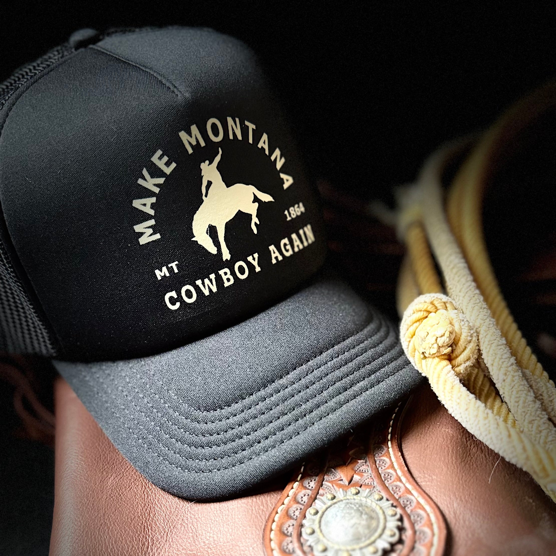 A high profile snapback cap with a curved peak, 100% polyester foam front and peak, and a breathable 100% recycled polyester mesh back. Montana Territory's iconic "Make Montana Cowboy Again" logo printed on the front crown, with the classic MT1864 embroidery on the side crown.