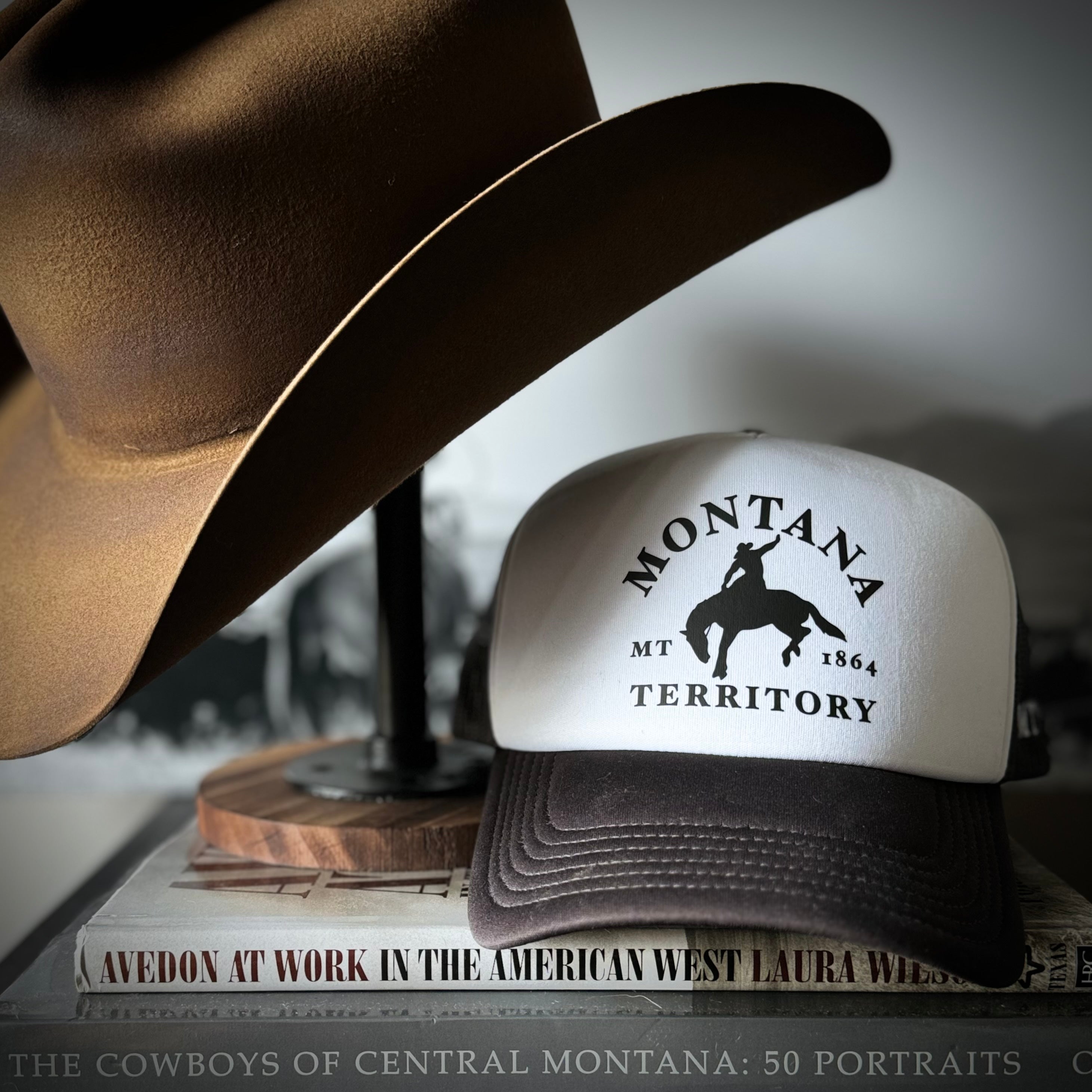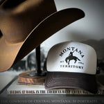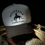A high profile snapback cap with a curved peak, 100% polyester foam front and peak, and a breathable 100% recycled polyester mesh back. Includes a contrasting front foam panel and plastic snapback closure. Montana Territory logo printed on the front crown, with the classic MT1864 embroidery on the side crown.