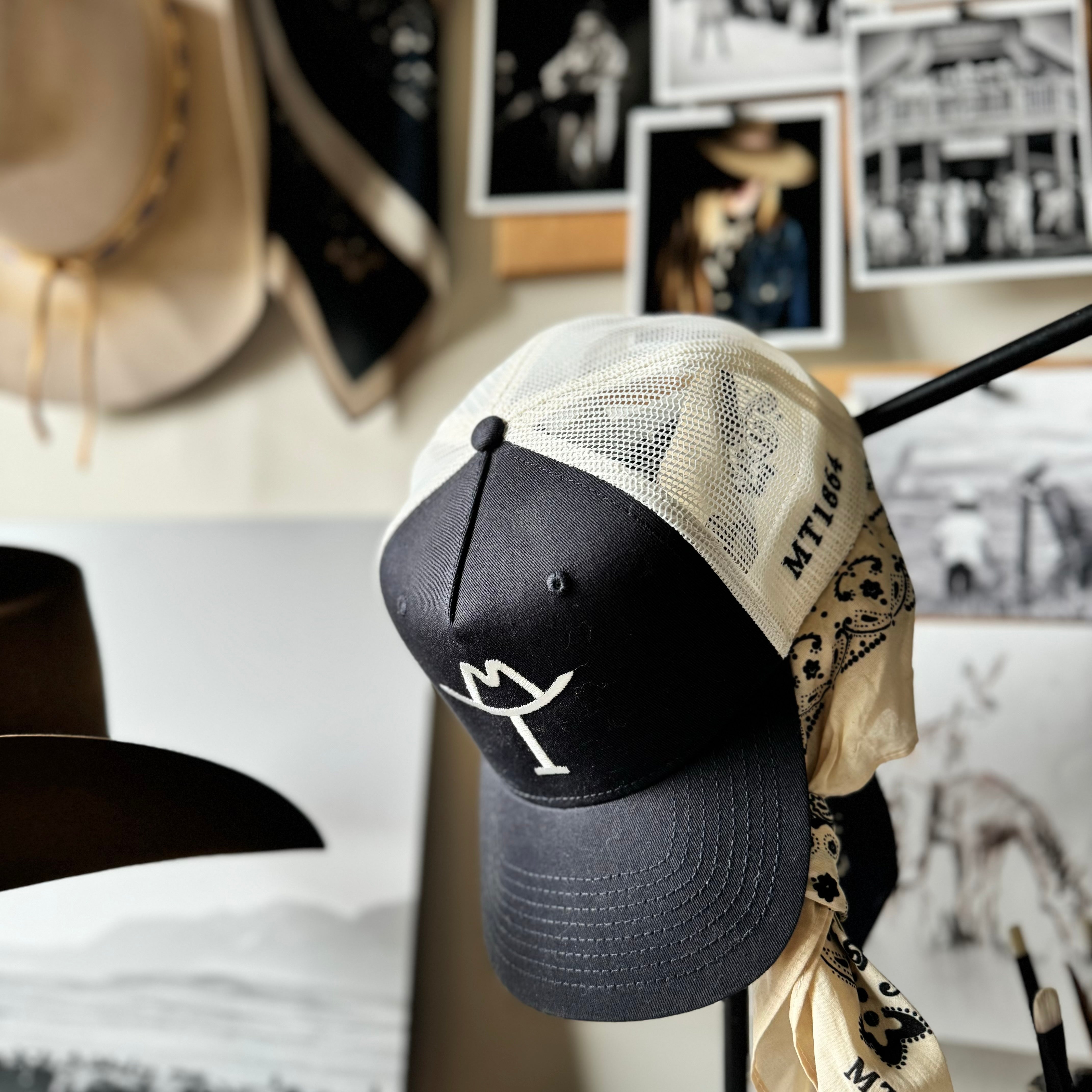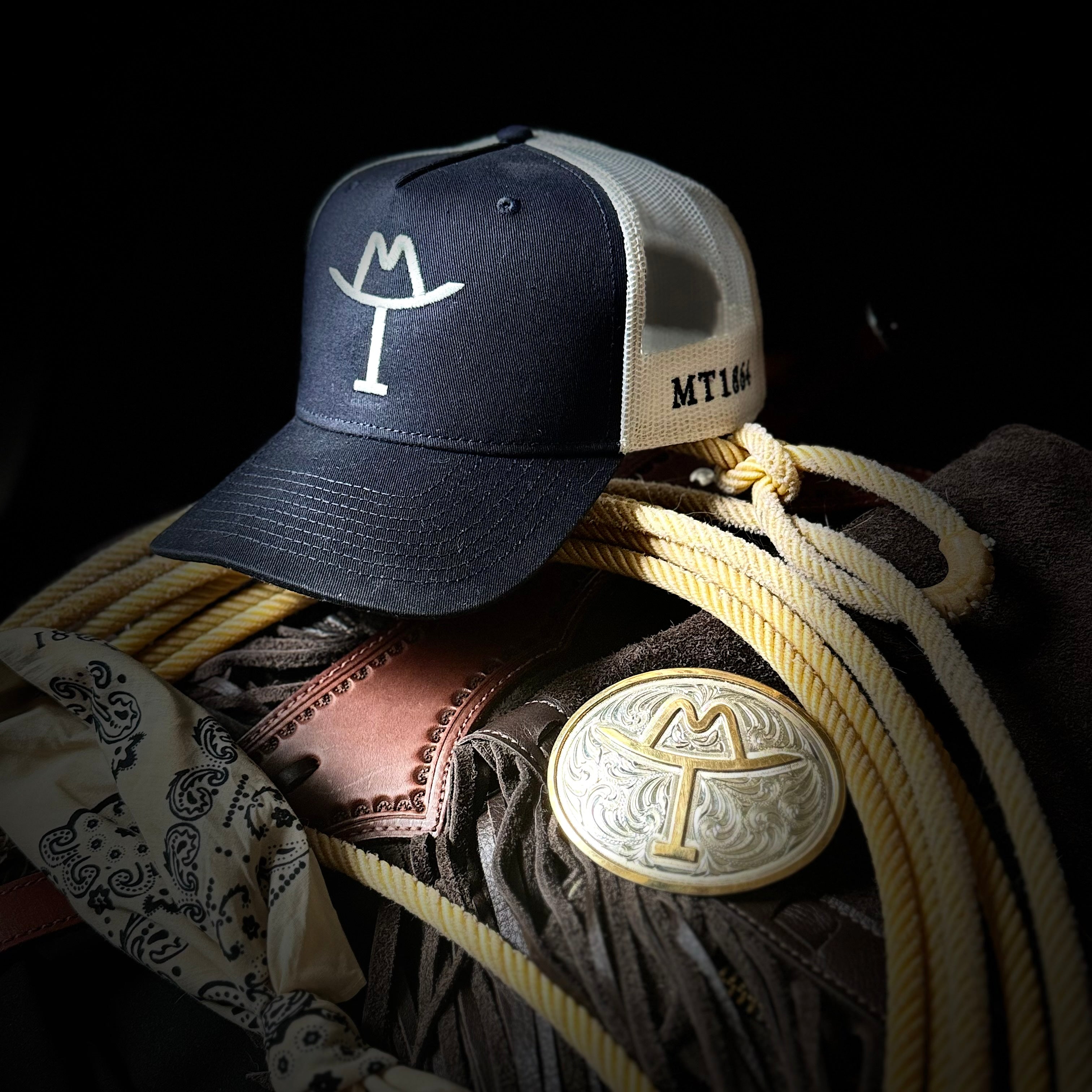 A high-profile snapback with a flat peak, crafted from mid-weight 100% cotton front and peak, breathable 100% polyester mesh back in a contrasting color. Includes a plastic snapback closure. Cream embroidered MT brand on center front, MT1864 embroidery on side crown.