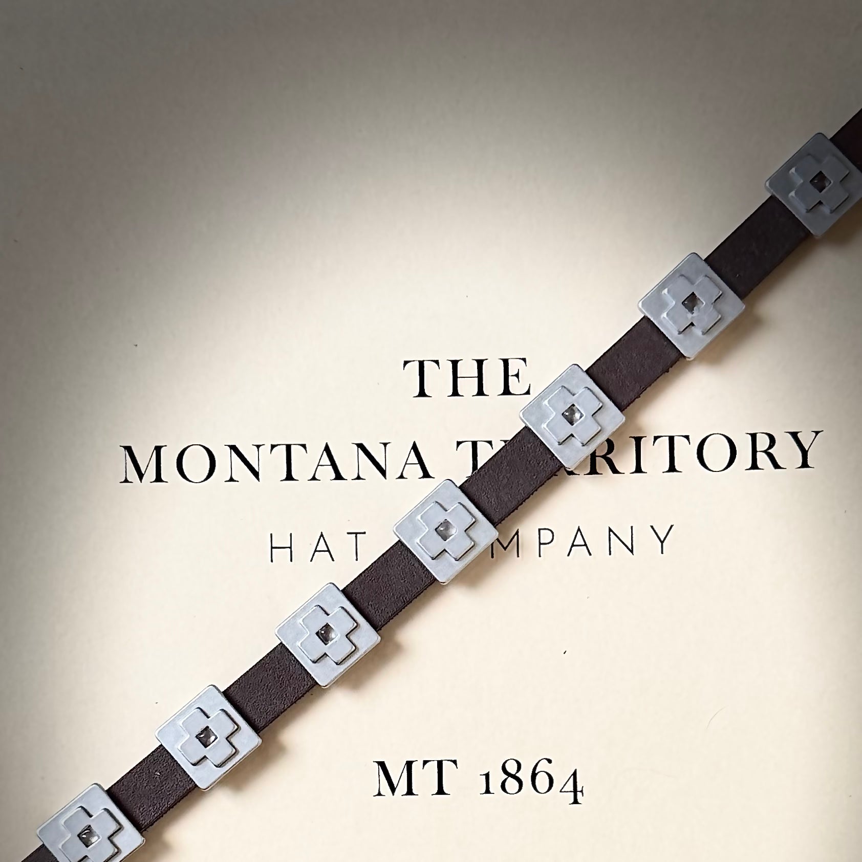 This hat band features 9 Navajo Cross conchos in a brushed nickel silver finish with inset smokey quartz stones on a 1/2" espresso leather band. The perfect compliment to any hat size, this hat band has an adjustable closure with 1/8" espresso brown deerskin leather lace that ties at the center back. You may trim the leather ties to your desired length. We tend to style them hanging off the back of the hat slightly.