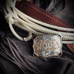 Hand crafted two toned silver and gold Montana Territory rectangle buckle. Engraved silver scrolls surround the Montana Territory 1864 brand bordered by black inset detail and pale gold border. Time honored tradition meets elegance. Dimensions 3.75” x 3”