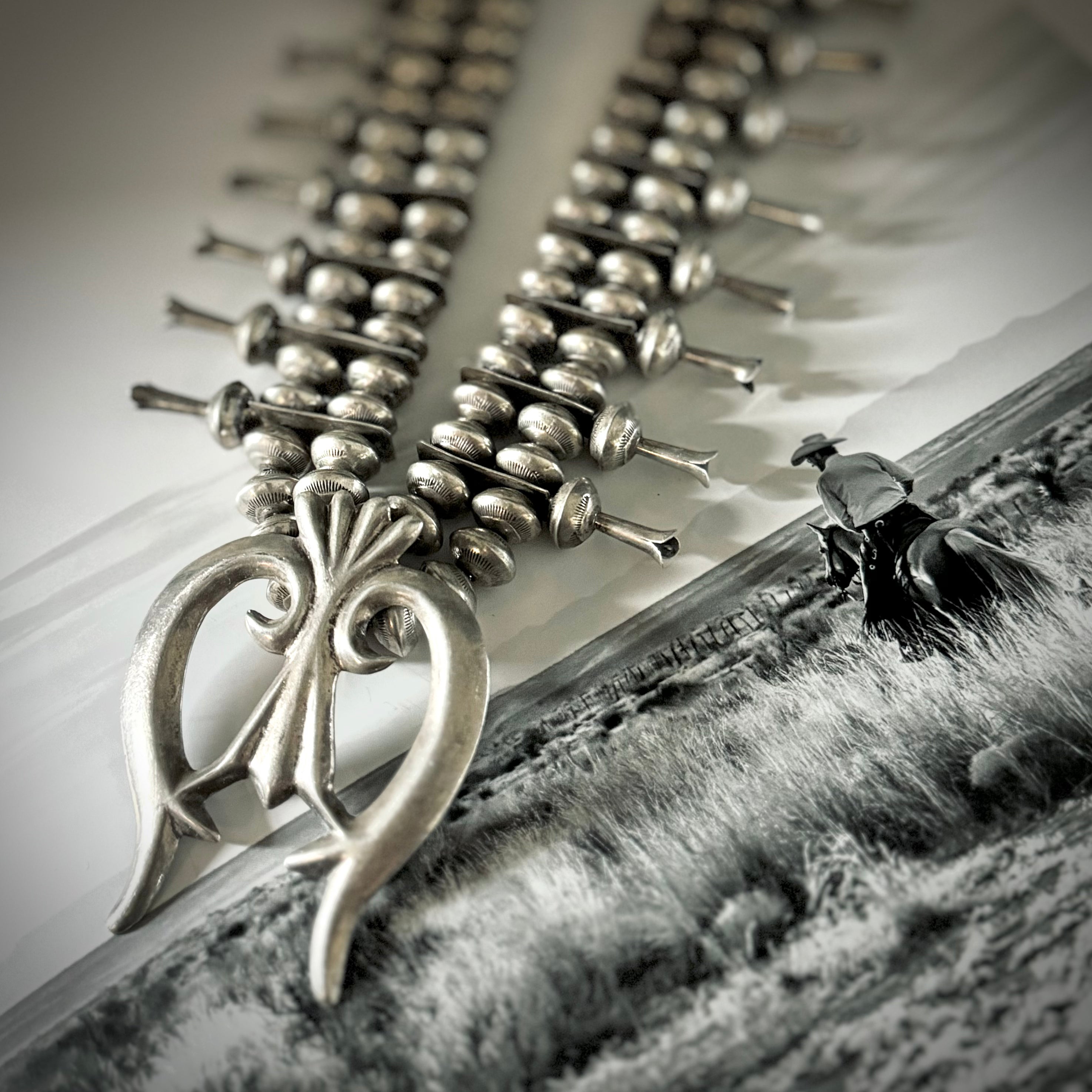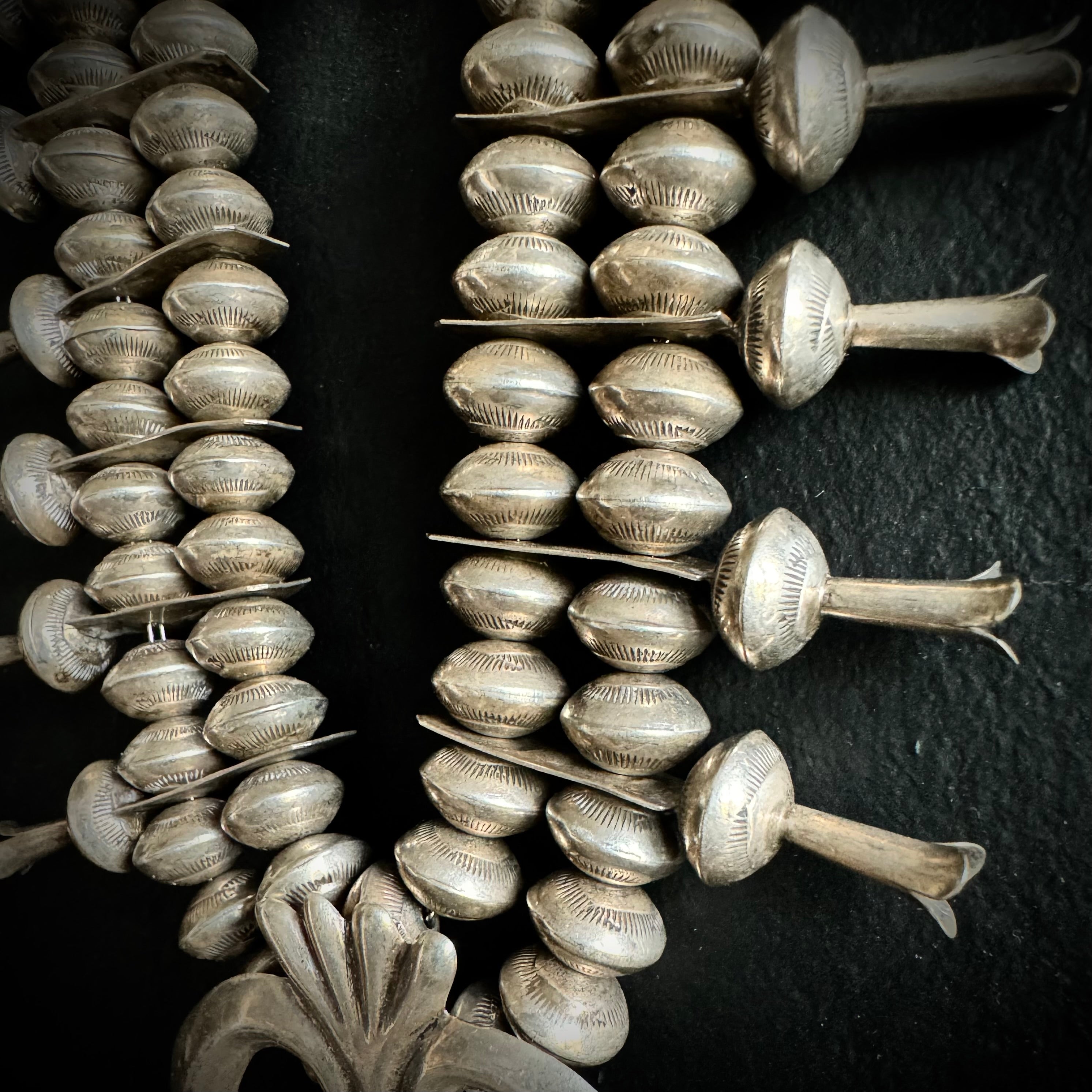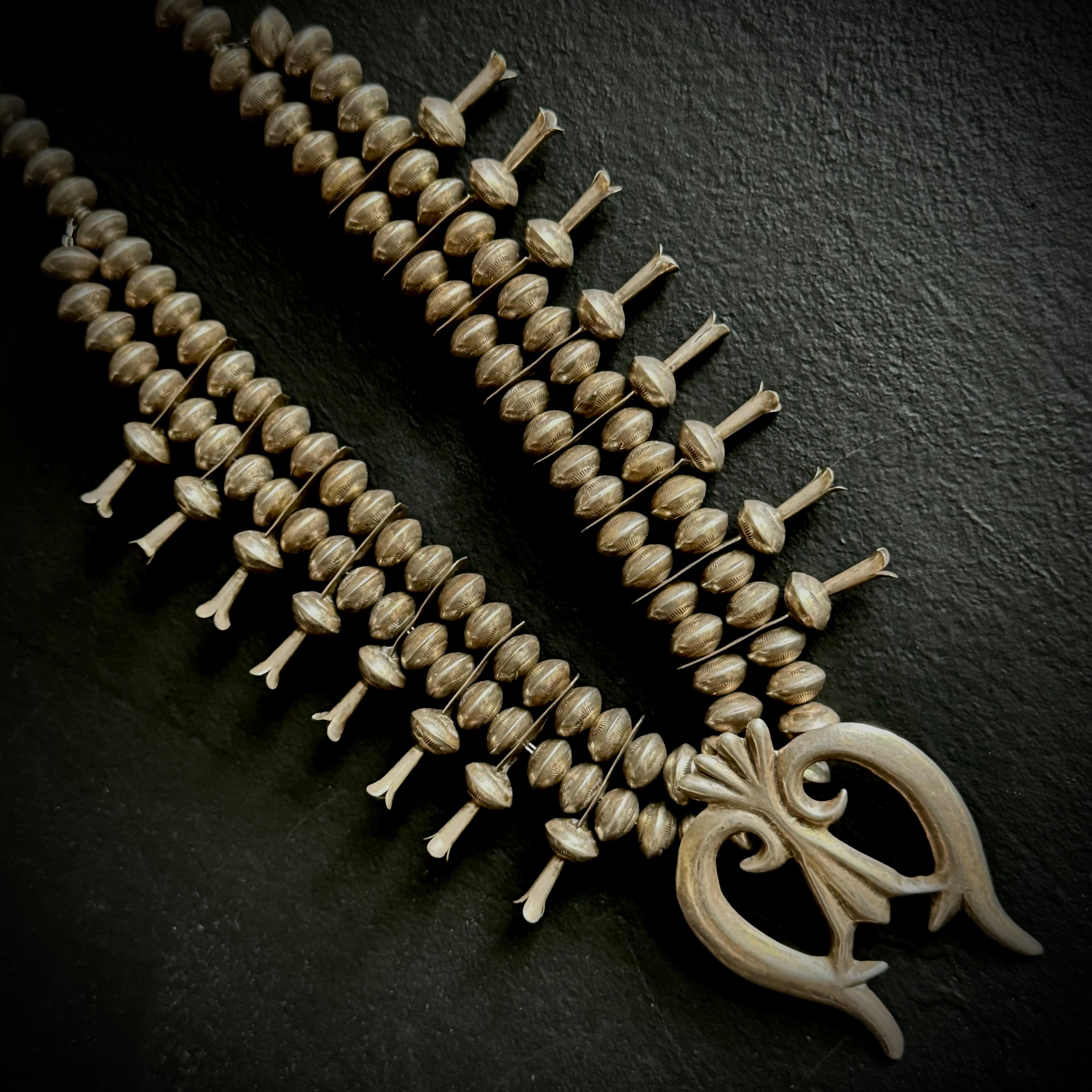 Vintage Navajo sterling silver squash blossom necklace. The term “Squash Blossom” refers to the unique flared beads that line a Squash Blossom necklace. Named for their resemblance to the blossom of a flowering squash plant. Squash was one of the primary crops that sustained the Native people of the Southwest, and is referred to as one of the four sacred plants of the Navajo. The hand made squash blossoms are incorporated amongst handmade navajo pearls and a sterling silver “Naja” centerpiece. The double strand and early period hand stamped navajo pearls make this particular necklace a truly unique collectors piece.