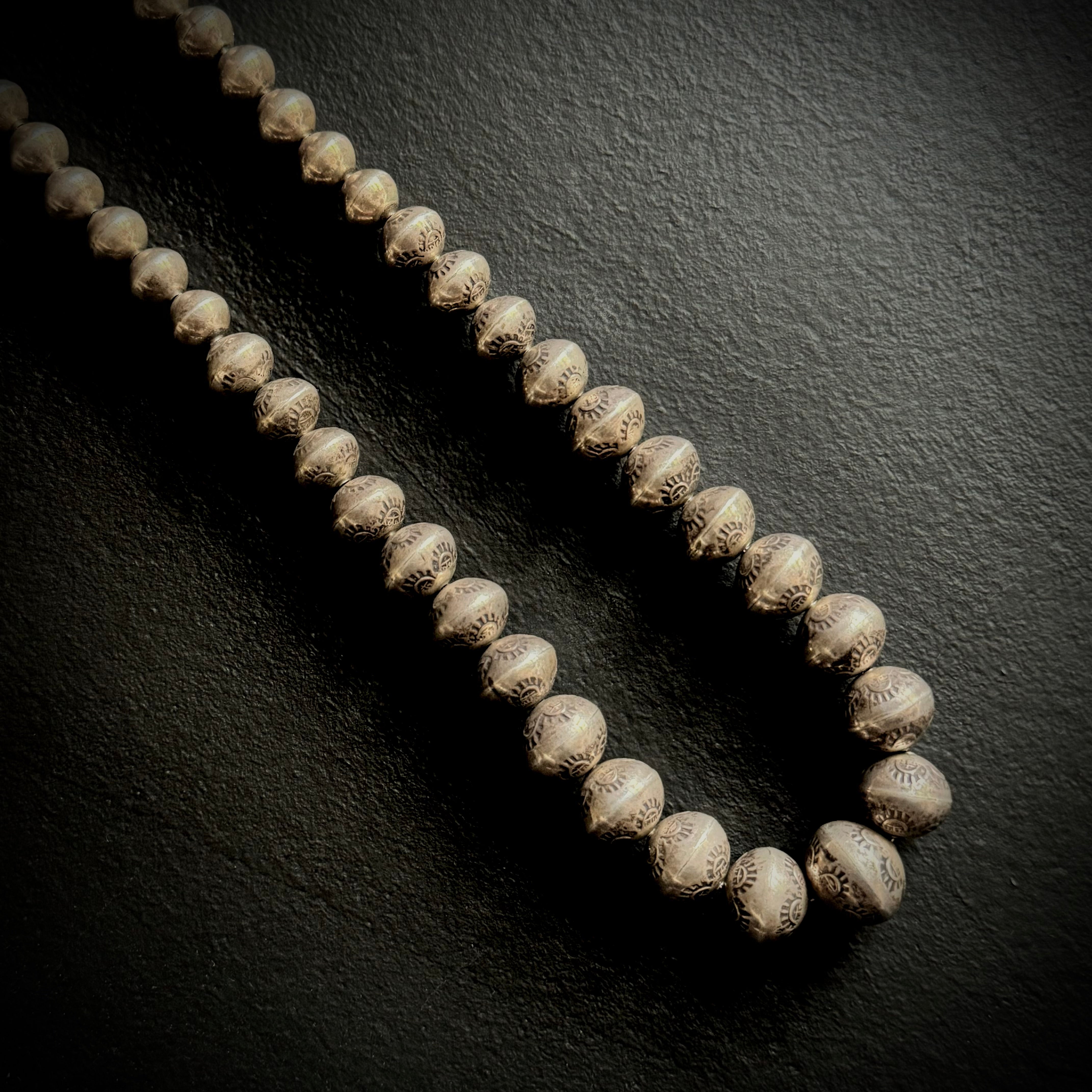 Navajo Pearls are a timeless and forever statement piece in the western fashion world. A rare and truly unique find, these early Navajo pearls were created with individual hand stamps. The artistry of the Navajo Pearl is a lengthy process as each individual bead is made by hand. Each bead is made of silver that is melted, rolled, and cut. Next, holes are punched, rounded, then each bead is sanded and polished. The finished strands have a substantial weight as a result of the heavy gauge silver of each genuine bead. In a genuine Navajo Pearl, you will see that each bead looks unique and very slightly differs from the others within the strand, unlike the uniformity of machine-made beads. Hand stamped Navajo pearls are an added layer of complexity, artistry, and precision. The result is a truly timeless and unique piece of art.